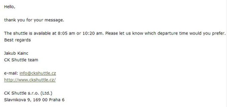 在这里有个小插曲,当时因为行程没定随便选了时间,后来想提前走,网上攻略说不能更改,而我想的管的他的先发个邮件给他(邮件地址就是你付款成功后他给你发确认信的地址),于是发了一封特别蹩脚毫无语法但勉强能懂的邮件给他,想到不回复就算了,大不了就当被偷了400捷克币(大概100多软妹币吧),结果当天下午他就回复我了,这点必须点赞,他让我选择早上合适的时间,就这么愉快的更改成功了,所以网上攻略没有及时更新,人家服务早就做在前面去了。