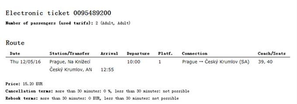 在捷克境内都可以选择坐student agency的班车。价格我们买成15.2欧元两个人、每半小时还是一小时就有一班,大巴很干净,车上还有巴少不时给添咖啡(巧克力不错)。起点在布拉格的Na Knizeci,就是地铁andel站旁边的汽车站。CK的终点有两个,你可以先定位你的酒店,再选择是在哪个车站下车,因为CK全是石头路,拖着行李走会让你有种砸箱子的冲动~!