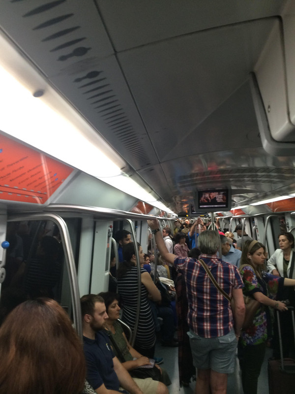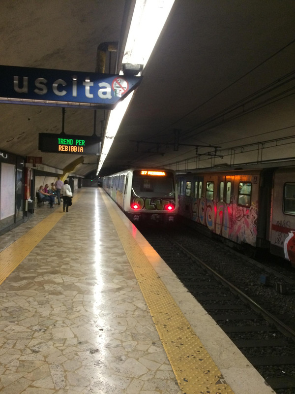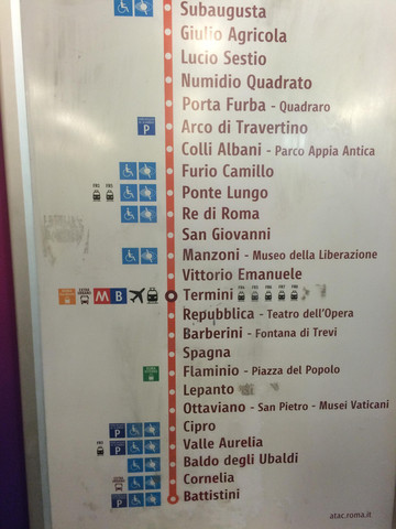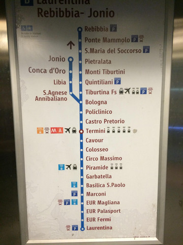 罗马有A线B线两条地铁,正在建设的C线已开通了一段,与巴黎发达方便的地铁系统相比罗马地铁有很大的差距,地铁A线为红线由西向东再转东南方向,B线为蓝线基本为南北走向,两条地铁在市中心的罗马中央火车站相交,地铁站标志非常清楚,A线为红M,B线为蓝M;