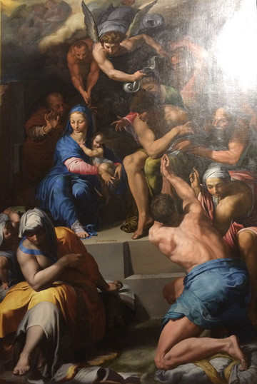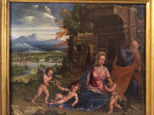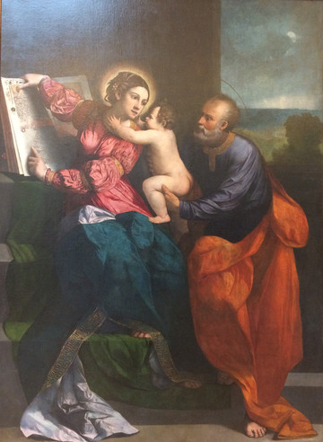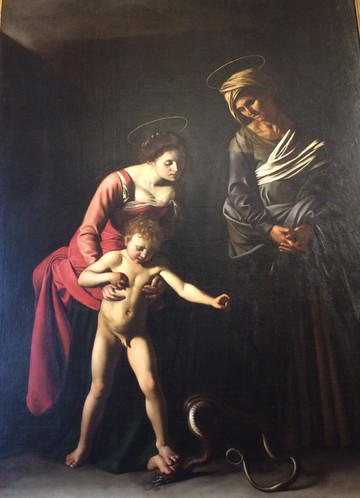 《圣母、圣子和圣安妮》是卡拉瓦乔在1605-1606年创作的极具争议的作品。画中圣母抱着耶稣,正在教他如何用脚踩碾象征原罪的毒蛇,旁边是圣母玛利亚的母亲。
