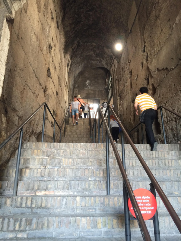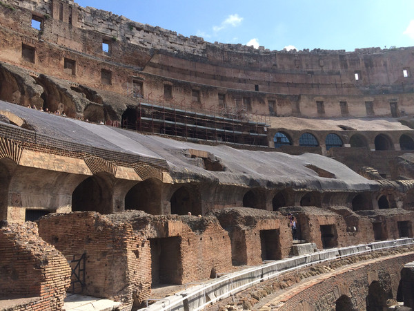 建筑外部,可以清楚看到57米高度的外墙,从下到上都是石块砌成,石块之间采用铁制抓钩连接,三层环行拱廊每层有八十多个,保证了内部最外层走廊明亮通透。