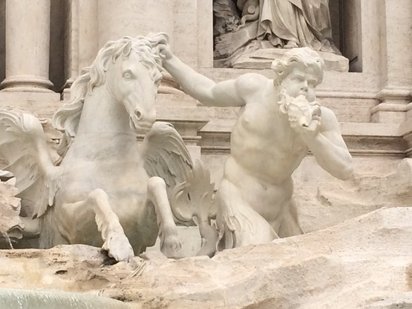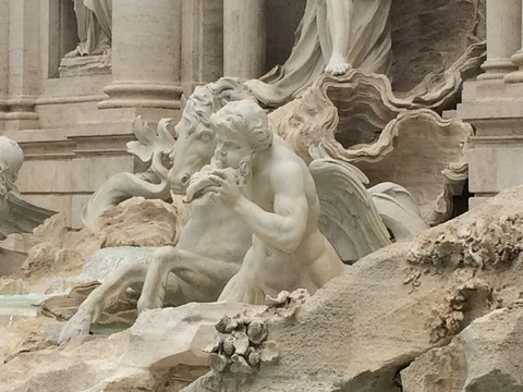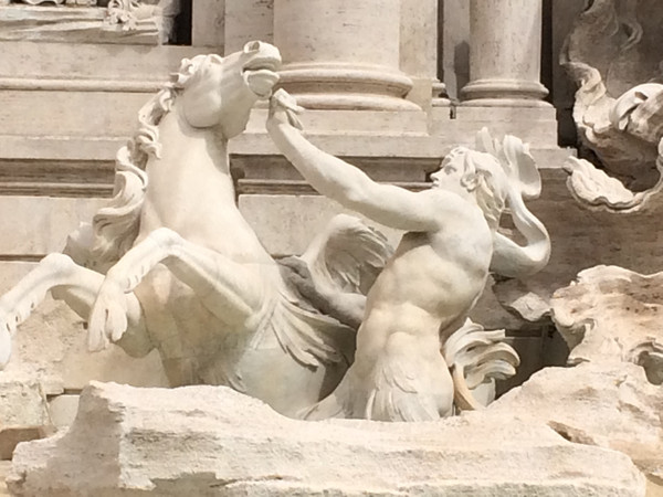 海神脚下是两个人身鱼尾的大海信使。一个在试图驾驭一匹暴躁的海马,另一个一手牵着一匹安静的海马一手在吹海螺。这象征着海洋有两种面貌,宁静平和与狂风暴雨。两侧是一个年轻女孩的浮雕,她的名字叫特雷维,喷泉也因此命名,据说她带着口渴的罗马士兵在罗马城外找到了泉水。后来罗马人建造了水道把泉水引入了罗马,为全城人供水。