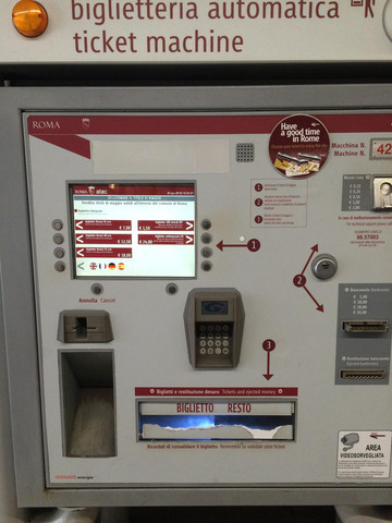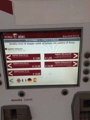 地铁入口的自动售票机可以买各种期限的车票,界面清楚使用也非常方便,地面公交上自动售票机只能买一次票,据说还不能找零,所以每天在地铁的售票机就把当天要用的车票一次买好。市内公交票价还是比较亲民,我们到奥斯蒂亚,从A线转B线再乘几十公里的小火车,不用出车站一张1.5欧的一次票就可以了。