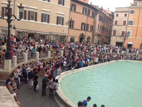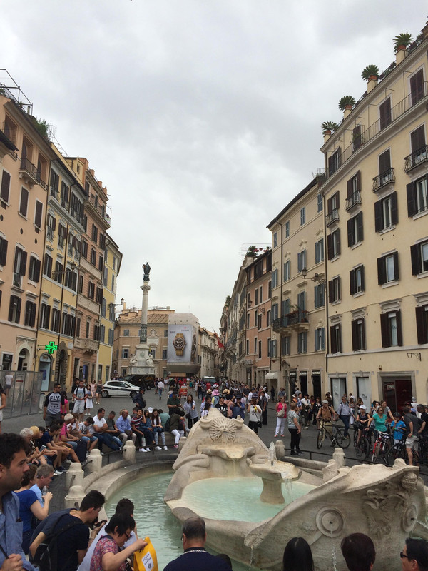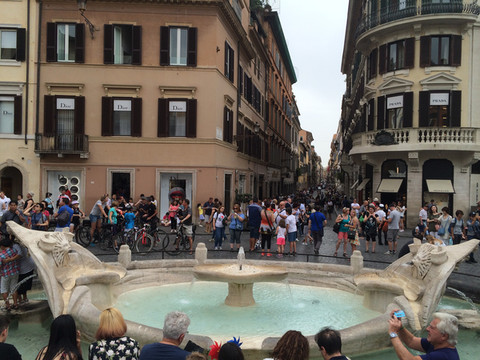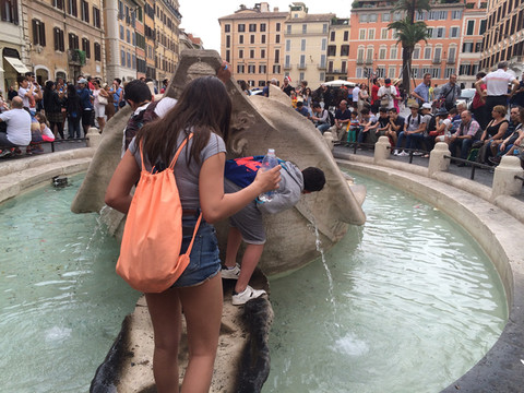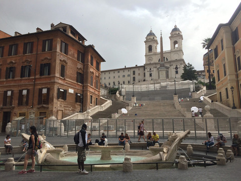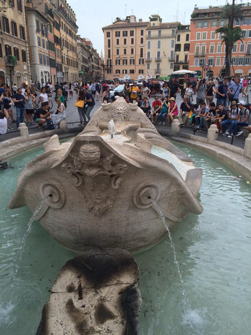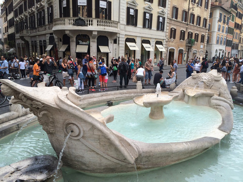 台阶前就是有名的雕塑“破船喷泉”,这里也是广场的中心,雕塑周围总是有人在歇息或拍照,一片热闹景象。船里流出的水还可供游人直接饮用。这座喷泉是贝尔尼尼父亲的作品,创意来自于特韦雷河的一次决堤,一只小舟被水推到这里。