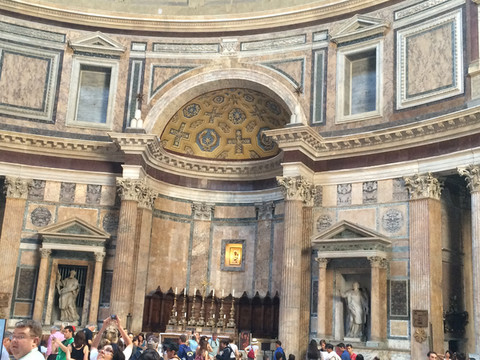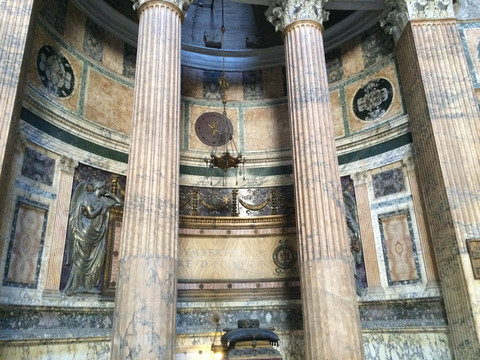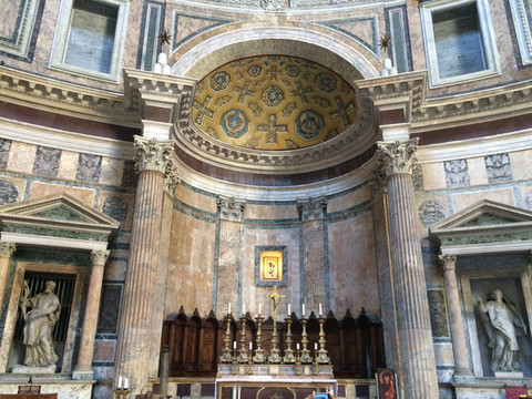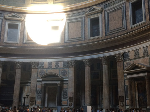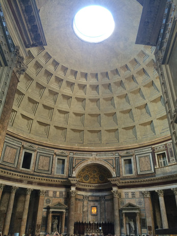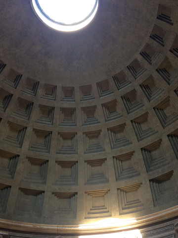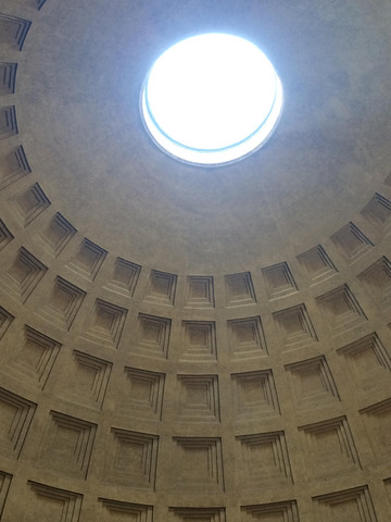 万神殿采用了穹顶覆盖的建筑形式,它也是罗马穹顶技术的最高代表。穹顶象征天宇,穹顶中央开了一个直径约9米的圆洞,整个大殿没有窗户,只有从穹顶射进来柔和光线,照亮大殿空阔的内部,弥漫一种宁谧的宗教气息,寓示神的世界和人的世界在此交融。