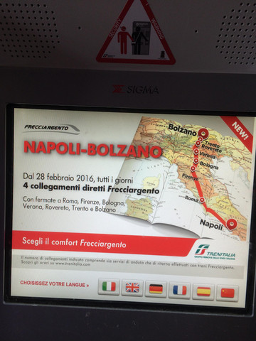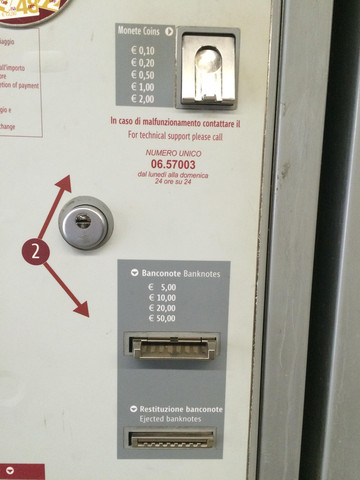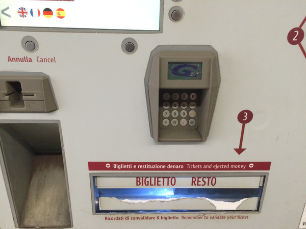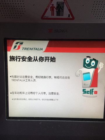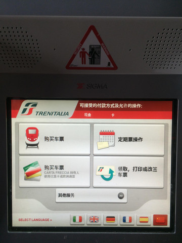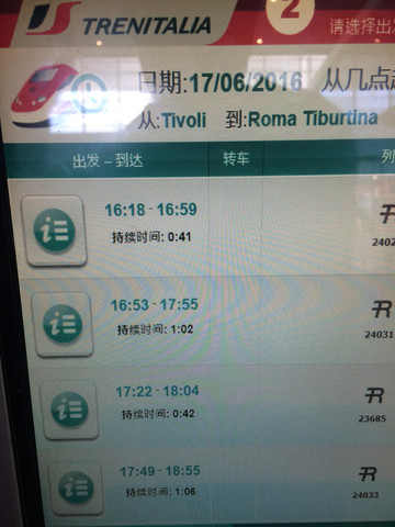 专线火车:罗马市内有几个火车站,乘坐专线车可以直接到相应的火车站买票上车。其中的中央火车站Trmini是市内交通枢纽,地铁AB线交叉点,到机场专线和其他大部分FL专线都在这里起始,地铁B线上的Tiburtina火车站有到蒂沃利的专线车。火车站的自动售票机赫然有中文界面,操作就更容易了,一步一步按界面提示操作,选择到达地、车次、付款方式、付款即可出票。即使如此,买票到蒂沃利还是小有周折,后文再详说。感觉票价差别较大,到机场和到蒂沃利路程都是三十多公里,到蒂沃利的票价是2.6欧,而到机场票价是14欧,是不是有点宰客呢?