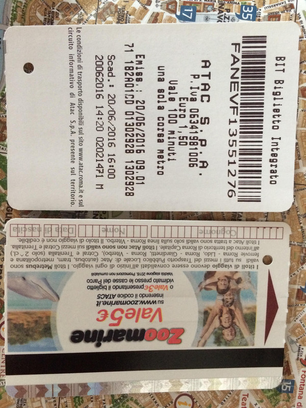公共交通:罗马的公共交通包括地铁、公共汽车、有轨电车、区间小火车都是车票通用,车票价格为:单次票1.5欧、天票7欧、两天票12.5欧、三天票18欧、7天票24欧。单次票第一次使用后,在100分钟之内还可乘坐上述其他公共交通工具,按此规定,先乘地铁再转地面公交一张票可以到达市内任何景点,每天玩2、3个景点买三张单次票就够了,在罗马的后几天我们都是买一次票出行的。有一点要注意的是,地铁进站是验票机自动打孔放行,没试过在地面公交已打孔的车票在地铁还能不能用。