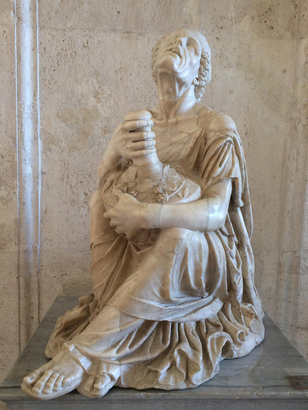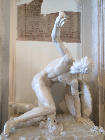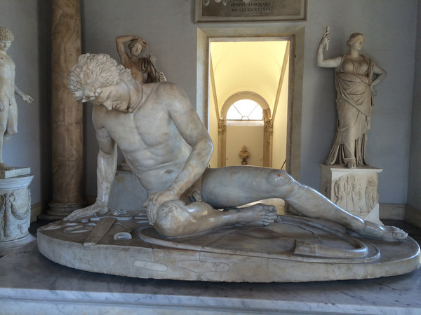 大理石雕塑《中箭的少女》,少女单膝跪地正试图拔出背上的箭,表情痛苦