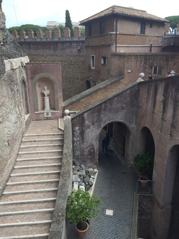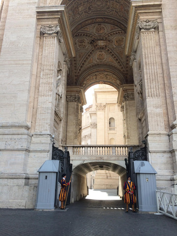 城堡大门往西,一条大道直通梵蒂冈圣彼得广场和圣彼得大教堂,据说两者之间在地下有一条暗道相通;1527年卡尔五世率领军队侵入罗马,教皇克列门斯七世让瑞士卫兵守住教皇宫,自己从秘密通道逃到圣天使堡避难;为了保卫教皇的安全,许多瑞士卫兵战死,此后的梵蒂冈就全部交给瑞士雇佣兵把守。