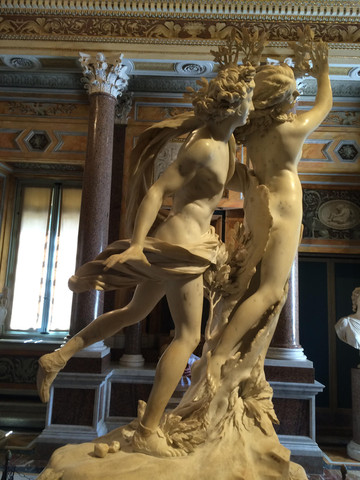 贝尼尼雕塑作品《阿波罗和达芙妮》,一种向上飞升的动感,达芙妮在触摸上方时面部的惊愕表情