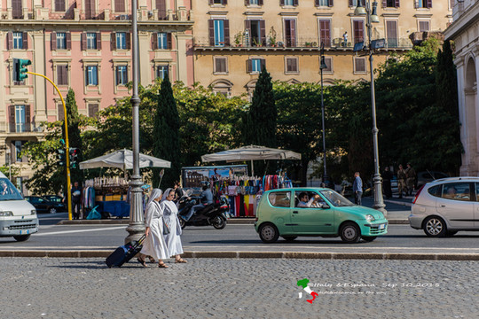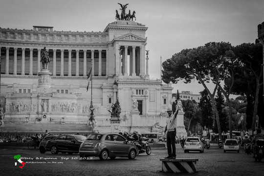 离斗兽场不远便是威尼斯广场,这个意大利电影出镜率最高的地方当真有意大利特色,如织的车流、戴白色钢盔的搞笑交警、青砖马路、错落的古建筑群,让初来乍到的我们想多停留一会,感受一会。
