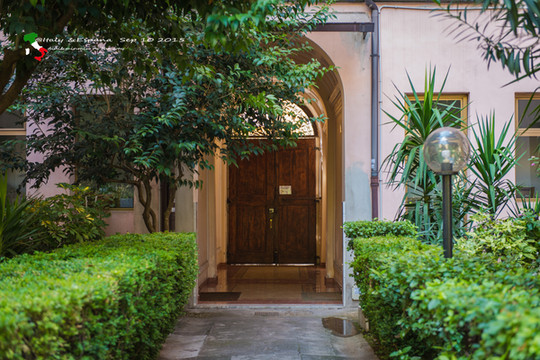 跟着路标顺利找到去市区的大巴,不到一小时的车程抵达罗马火车站。 机场大巴一般会在火车站作为落客点,从罗马火车站可以选择地铁去往市区各处,非常方便。 顺便考察了第三天取车的地点。在罗马火车站乘坐地铁到达我们在罗马的家,位置不算市中心,但地铁很方便,是airbnb上预订的一处花园式公寓,独立居住,配套一应俱全,住着很舒服,下面这图是院子门口大门的照片。