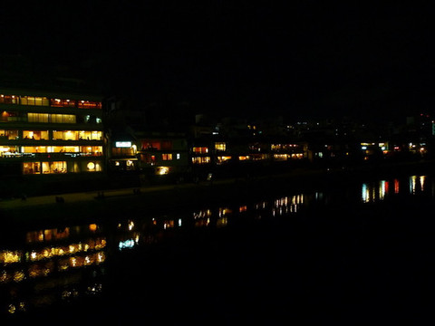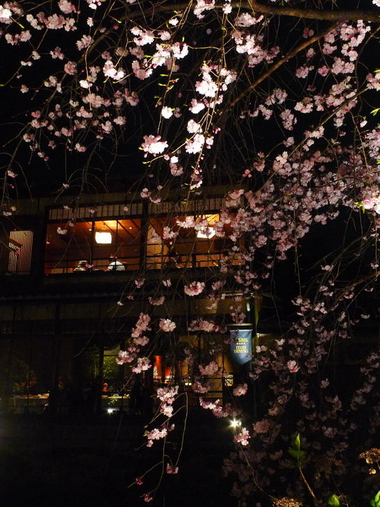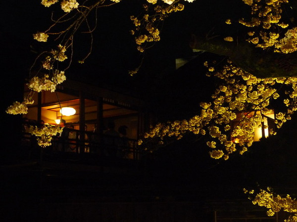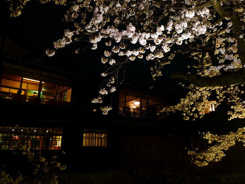 昏黄的灯光下,隐约传来艺妓们和客人唱歌聊天的欢笑声,游记中白川夜樱最常出现的画面之一