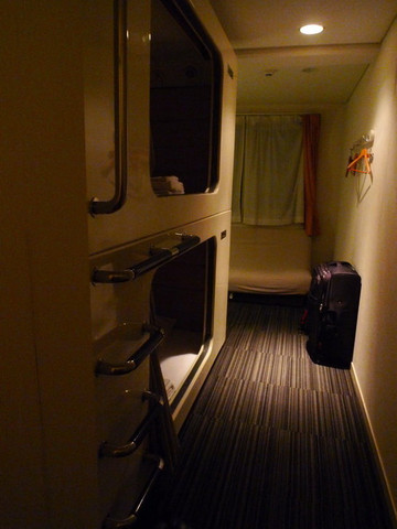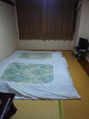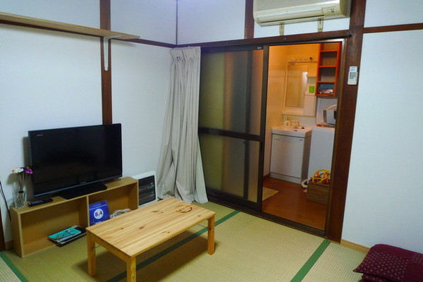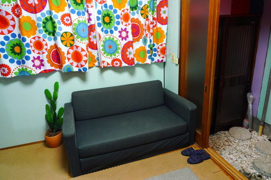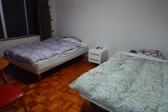 当然除了地理位置一般外这家类似民宿的公寓还是性价比不错的,13500日元的价格是一整栋楼(晚上超过10点入住要另外加付1000日元,我们那晚十一点才到,只能多付了这笔钱),只限女性住客,楼下客厅加厨具齐备的厨房间和卫生间,楼上一间西式卧室,一间日式卧室,预定页面显示最多可以住十人(当然其实不可能住那么多人,毕竟只有一个卫生间),住四人还是绰绰有余的,我们两个人在空间上就非常宽裕了,床也很大且舒服。出门就是一家便利店,我们去买了盒饭和牛奶面包当晚饭和早饭。