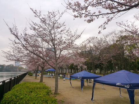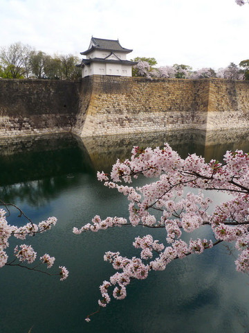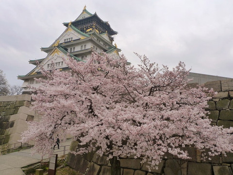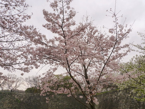 而正面的这棵则只开了两三分。不过没关系,四天后会再回来大阪城看那时应该已经满开的樱花。