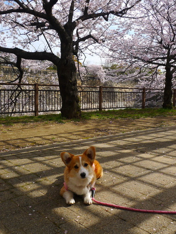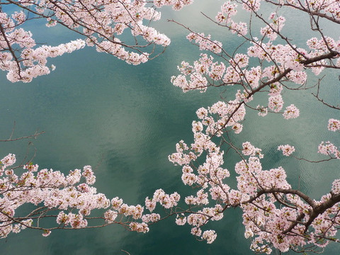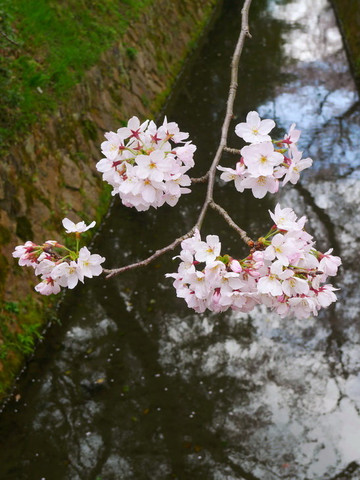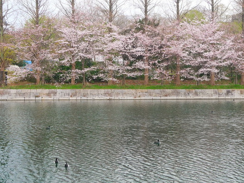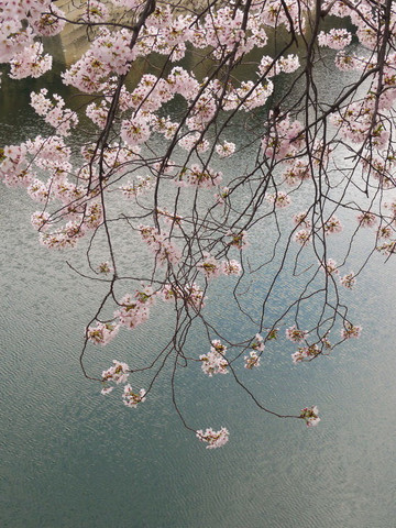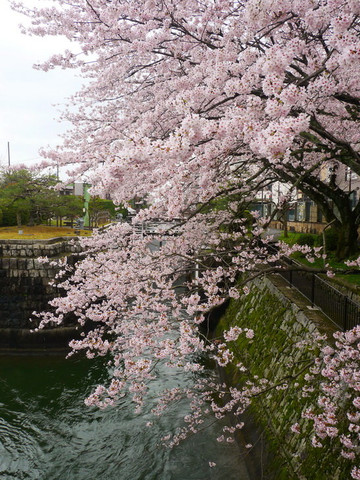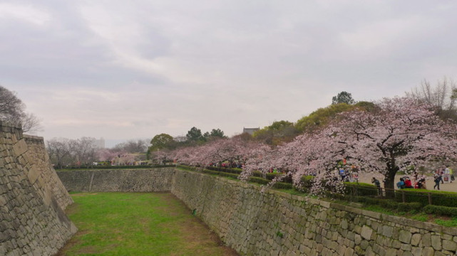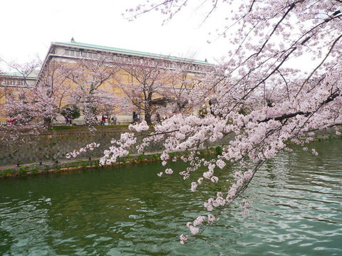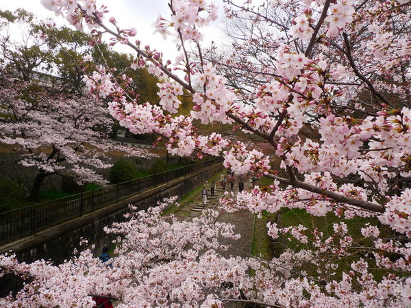 再往前走就是护城河,河边的樱花也开了七八分。可惜天气不佳,看上去有些黯淡。