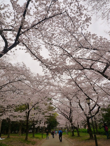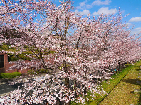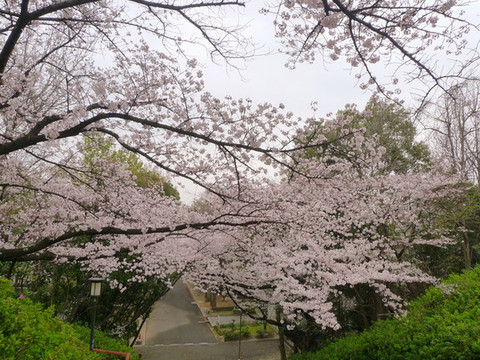 这个入口行道两边的樱花正满开,但树龄可能比较小,所以不够壮观