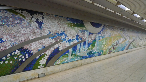 地铁站台的樱花墙饰