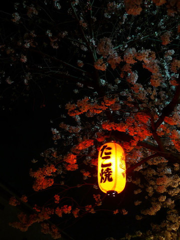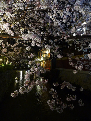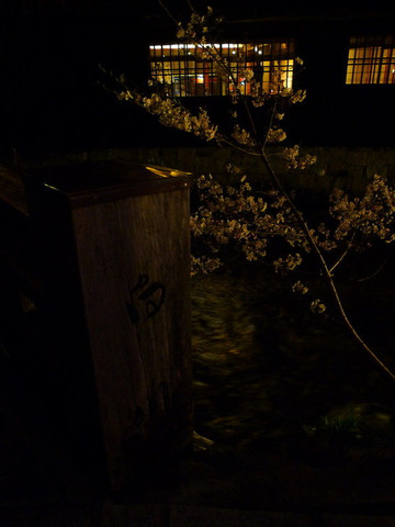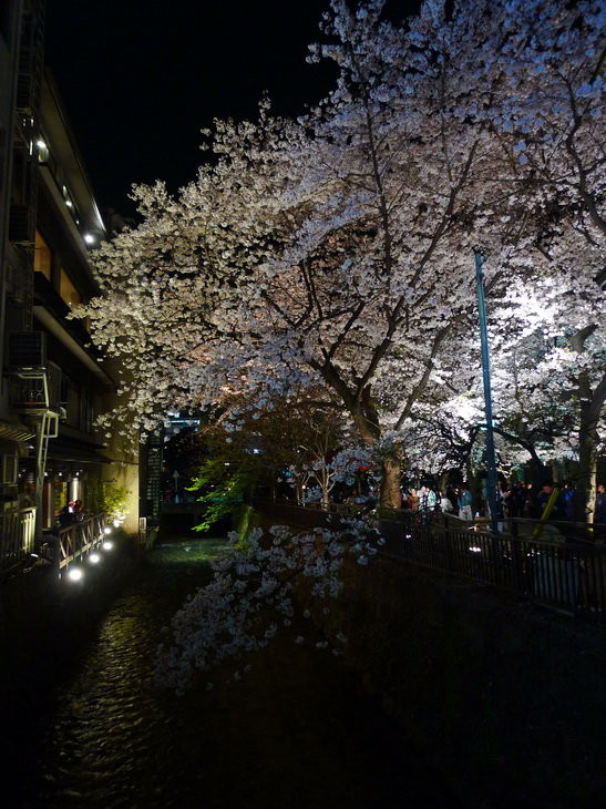 回酒店睡了一觉后出发去看白川夜樱。白川在花见小路的右面那条街,花见小路一般大家都去左边那条街,因为右边的街道店铺比较普通,没什么特色,走到底左拐就能看到人群簇拥的白川夜樱了。