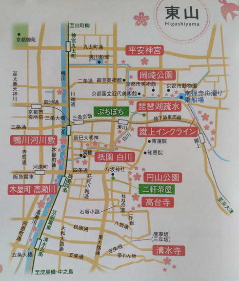 此次在京都住的Amenity Hotel Kyoto (京都舒适酒店)位于高台寺和之间的主干道上,地理位置相对不错。但之后几天的赏樱路线给我的感觉是如果来京都单纯为赏樱,那酒店的最佳位置应该订在祗园和地铁东山站之间,因为京都的赏樱点大多集中祗园和它的东北和东南面(如下图所示),如果住在这个位置,蹴上铁路和哲学小道可以很方便地乘地铁东西线或从酒店步行过去,醍醐寺和三井寺是乘地铁东西线,河源町、白川、圆山公园、高台寺、清水寺都是步行距离。我们住的这个酒店还是偏下了一点,向上走到八坂神社和圆山公园要十分钟左右,走到地铁东山站要二十分钟左右,虽然它离清水寺和高台寺很近,走走两三分钟,但是清水寺因为以前去过而且据说樱花季团队游客太多,这次也就没去,高台寺虽然去了但感觉非常不值,是赏樱景点里最坑爹的一个,不去也罢。