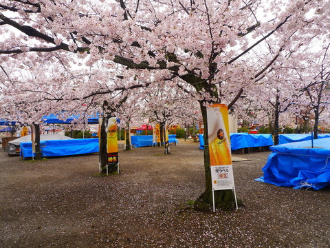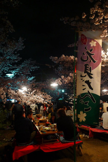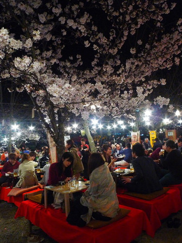 夜晚喧闹的樱花树下聚餐点白天只是安安静静的叠放着桌椅
