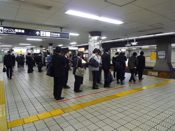 乘地铁去大阪城看满开的樱花,西装革履的上班族,大家都自觉地排队等候地铁