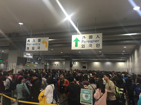 晚上18:30准时抵达机场,到了入境大厅着实给吓了一跳,想到樱花季人多没想到这么多!虽然排队等候的牌子上写的等待时间30分钟,但最后办好入境手续已经过去了一个半小时。