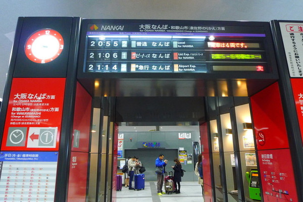 从关西机场到难波的南海电铁特急列车要1130日元,急行是920日元,快速也就快10分钟,为了省钱我们乘了21:14的急行。