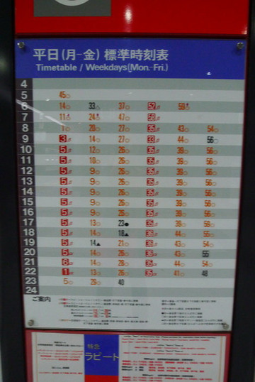 南海电铁时刻表,红色的是特急,黄色的是急行。