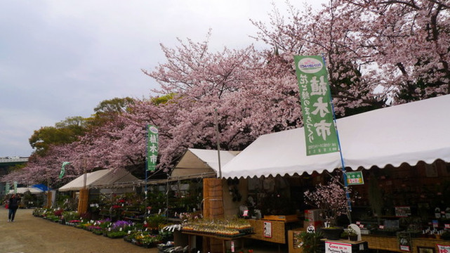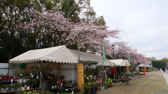路边是卖绿植的小摊,这么小棵的樱花也能开这么多花哦