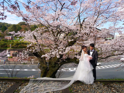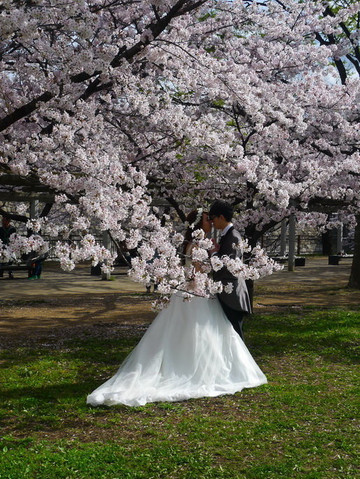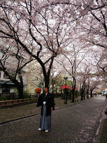 夜晚令人惊艳的这片樱花白天倒显得普通,这对新人估计新郎是篮球运动员吧,拿着篮球拍新婚照,有创意的!