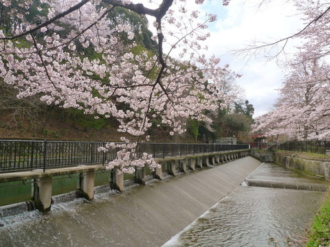远远地看到了水渠和大片的樱花