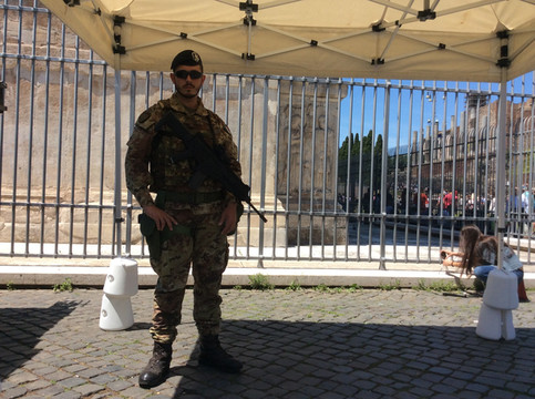 罗马凯旋门不远处,停着一辆装甲车,遮阳伞下站着两名全副武装的士兵,其中一个留着小胡子的兵有点小酷,趁其不注意,赶快拍了一张留作纪念。