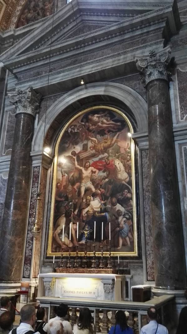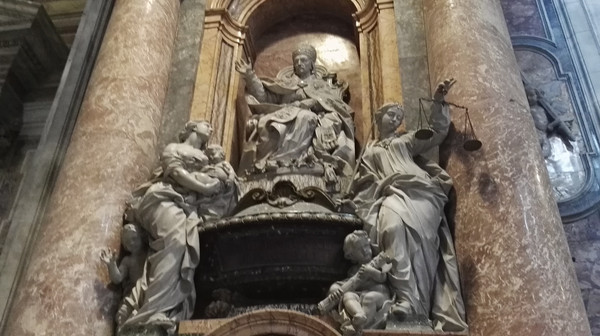 有一处教皇祭台很有趣,这位教皇叫亚历山大七世。据说这一雕塑是意大利大师贝尔尼尼的收山之作,精美到极致兼宏伟大气,尤其是彩色大理石雕刻的覆盖着石棺上的幕布,居然连皱折都清楚可见,可谓栩栩如生。