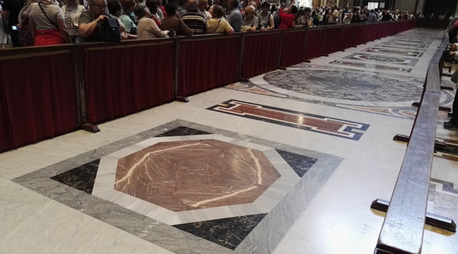 另一处有意思的是一条镶嵌着微章图案的大理石通道,上面刻有世界排名前五名大教堂的名称,梵蒂冈圣彼得大教堂位居第一,然后依次为:意大利米兰大教堂、西班牙赛尔维大教堂、意大利佛罗伦萨大教堂(圣母百花大教堂),英国圣保罗大教堂。