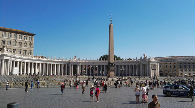 愤愤不平之中,我们的大巴车开进了梵蒂冈的地下停车站,等我们走上地面时,才发现自己已经置身于一座巨大的三角形广场之中。