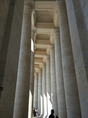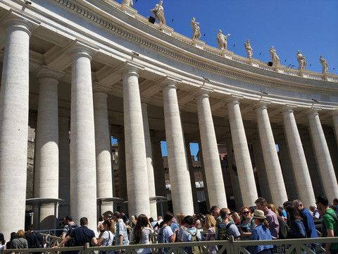 在无处不在的烈日爆晒之下,我们的排队终于进入了圣彼得大教堂前的圆柱走廊,经过了安检门,没有了阳光的烘烤,我们的苦难终于结束了。