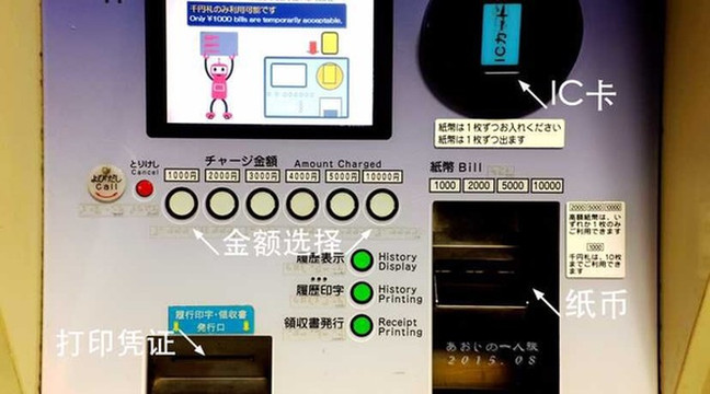 然后是充值,其实也非常简单,和帝都的充值没什么两样。插卡-选择金额-放钱-打印凭证,至于一次充多少,那要看你坐地铁的频繁程度了,基本上两站也要140日元。回来之后看了一下我的充值记录大概冲值了1万左右,朋友给我卡的时候里面大概还有个一两千,也花钱买过几次票,基本上就是全部的交通费用了,可以作为参考。