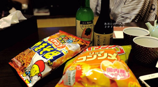 拿出下午买的零食和清酒,打开电视。