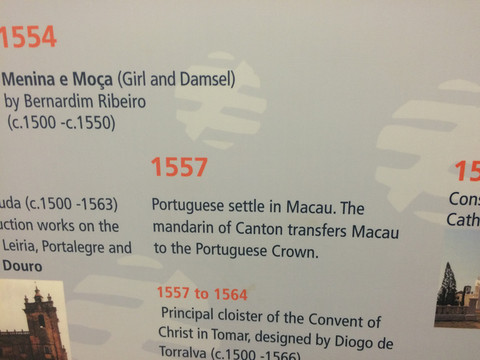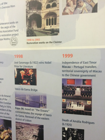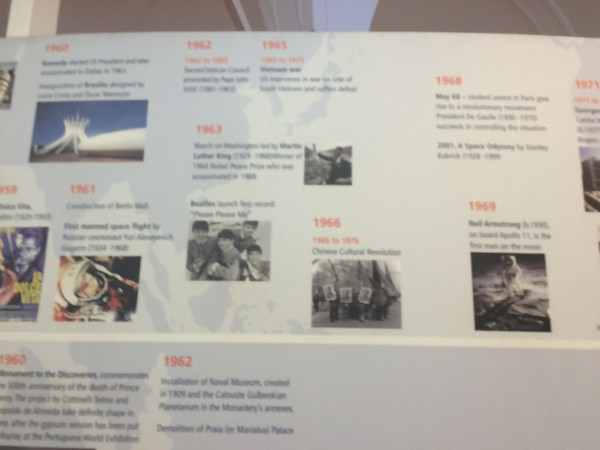 这里最有意思的是介绍葡萄牙的历史。 在二楼的一个厅里,有一个大圆圈,外面是英文,反面的葡萄牙文。 介绍的方法顺着圆圈有两栏,上栏依时间的世界历史大事,下栏依时间对照着是葡萄牙的历史,这种介绍历史方法让人一目了解,这个时期历史在发生什么事,而我们葡萄牙有些什么事。