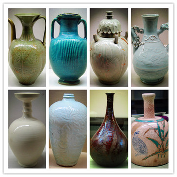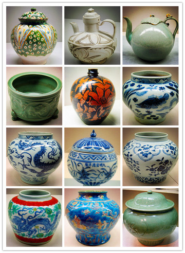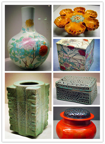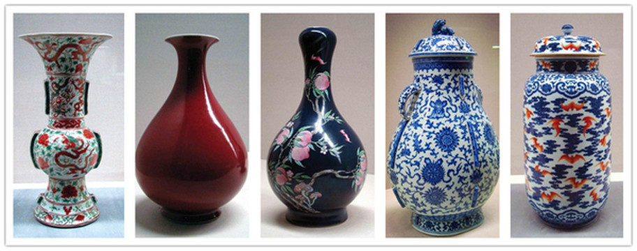 明万历五彩龙牡丹纹瓶、18世纪蓝釉粉彩桃树纹瓶、清乾隆红釉瓶清乾隆、青花红彩蝠云纹壶等等。