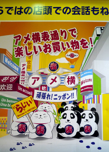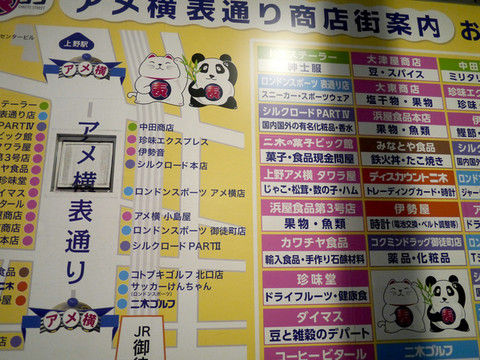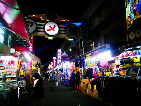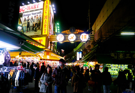 上野站旁边就是阿美横町,如果还有力气的话,顺便逛一逛会有惊喜。阿美,就是美国,这里是二战后日本物资短缺时,各种来路不明军用物资集散的市场,现在已经发展为无所不卖的地方,包括服装、药妆、杂货、鞋帽、海鲜、果蔬、餐馆、干货、副食品、五谷杂粮,价格便宜,也有一些名牌仿冒品,大量的国人聚集在这里,吃着沙县小吃。