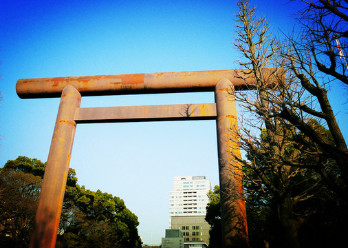 靖国神社占地不大,门口的大鸟居很特别,不是木质的,也不是石质的,而是铁制的,好像取材于战争时期沉没的潜艇什么的,上面锈迹斑斑,显得非常沉重,一块10米高刻有“靖国神社”的石碑立在路旁。