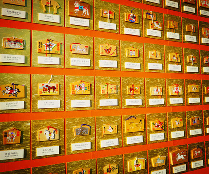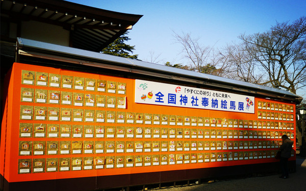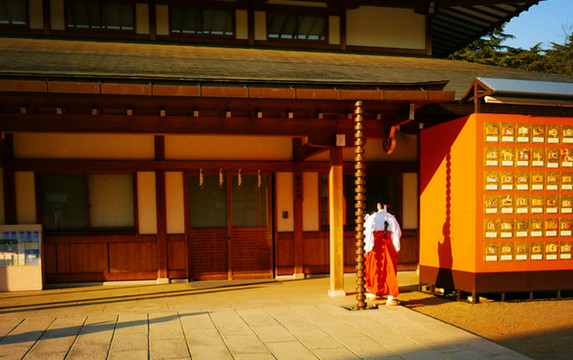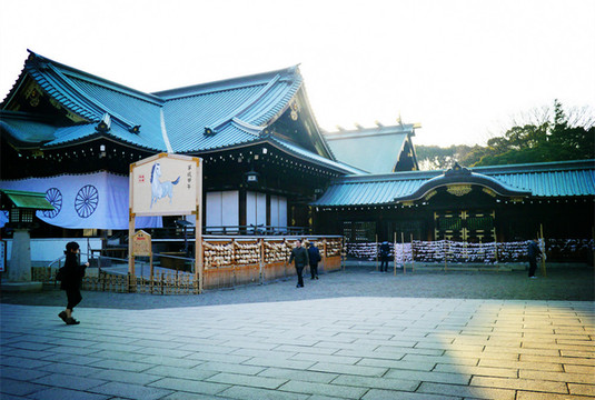除了设计和陈设方面有军国元素外,里面也没有特别浓烈的军国主义氛围,没有门票,没有自卫队,没有任何监管,女巫们穿着大红色的袍子进进出出,民众们该摆摊摆摊,该抽签抽签,该过年过年,院子里展示着一整排漂亮的马年新春绘马。