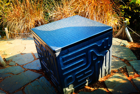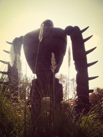 登上铁笼旋梯就来到顶层草坪,近四尺高的《天空之城》机械兵就站在你的面前,杂草中还原了一块黑色的拉普达中枢石碑,写满拉普达文字。