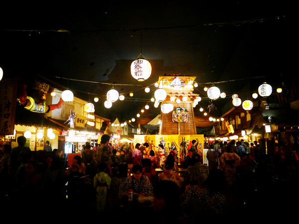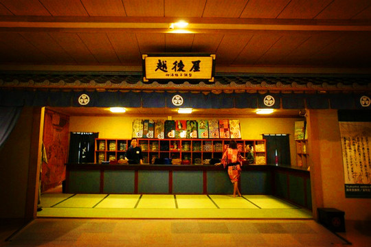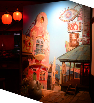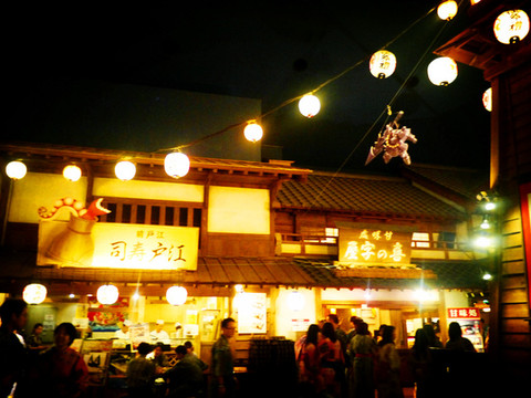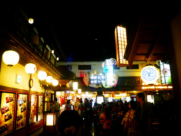 上街就直接进入了一个“广小路”式的江户风貌的古老街坊,街面上都是各种各样的日式小吃店和传统民间游戏摊,天空是人工的月夜,悬挂着小小的忍者和亮晶晶的小飞镖。o(* ̄︶ ̄*)o