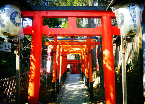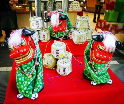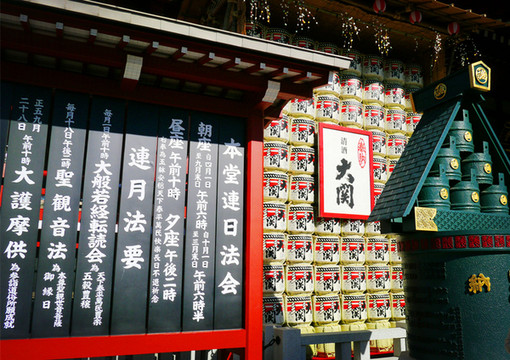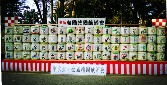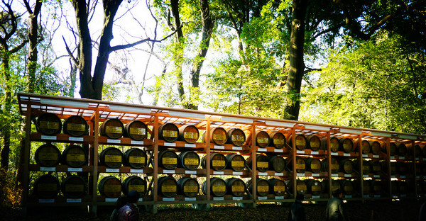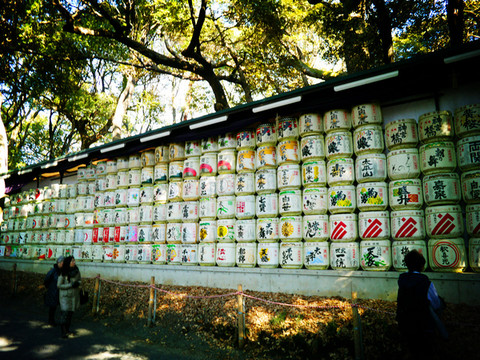 参道尽头两旁各有一列酒桶,有西方葡萄酒酒桶,也有日本清酒酒桶,是新年各个企业对神庙的供奉。