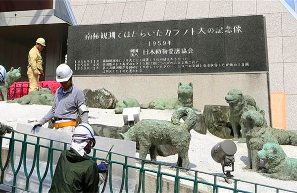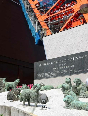 原本铁塔大楼的入口处还有一群南极桦太犬雕塑,是为了纪念日本南极观测队于1956年首次登陆南极被迫遗弃了其中15只狗,直到1959年观测队再次前往南极基地时,才发现有两只狗仍然生存,就是电影《南极大冒险》的素材。“太郎”与“次郎”生还的消息在日本带来不少冲击与感动,日本爱护动物协会邀请曾经制作过忠犬八公像的雕刻家安藤士,为这15只桦太犬制作了纪念雕塑,设置在东京塔下,不过2012年为了绿化建设进行了搬迁,所以没有看到。
