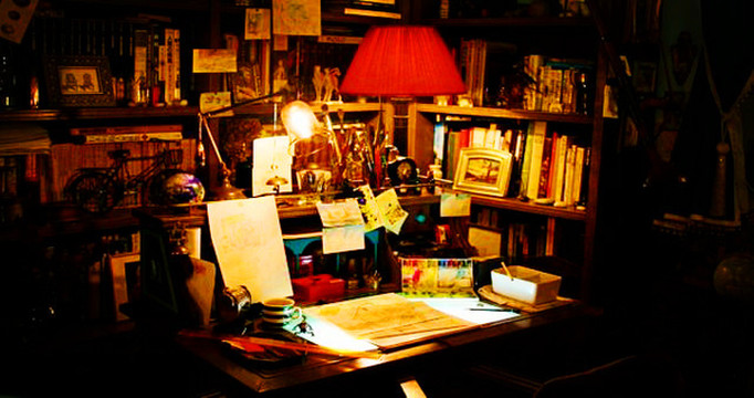 二楼房间分为两个部分,一个是特展室机阅览室,有一些关于飞行器的设计理念、构想源头,以及大师几部作品中所设计出来的武器介绍、剖析。另一个是宫崎骏大师的工作室,这里的桌面、书架上都不是收拾的很整齐,感觉上就像是有人刚用完、刚离开座位一般,书架上有许多关于宫崎骏作品的资料和珍贵手稿。