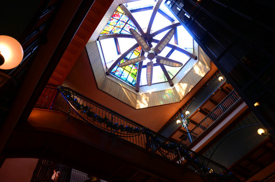 进入馆内首先注意到的就是中央大厅,螺旋木质楼梯最高处悬挂着手工琥珀吊灯,彩绘玻璃非常美丽。